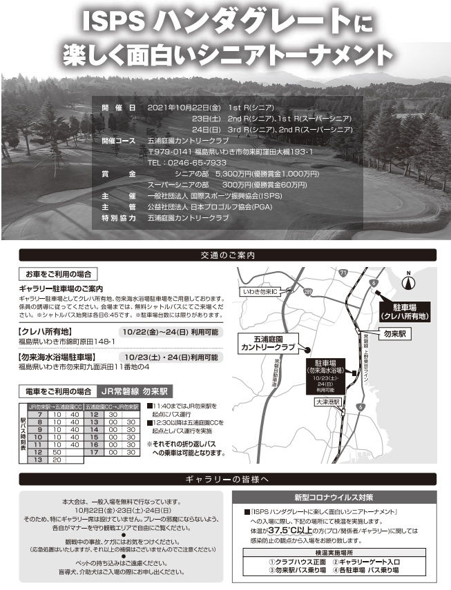 ギャラリー駐車場の案内小野 五浦庭園CC2021年10月9日読了時間: 1分2021年 PGAシニアツアーISPS ハンダグレートに楽しく面白いシニアトーナメントのギャラリー駐車場のご案内です。さらに、グレートに楽しく面白い 企画があるそうです。決まり次第お知らせします。